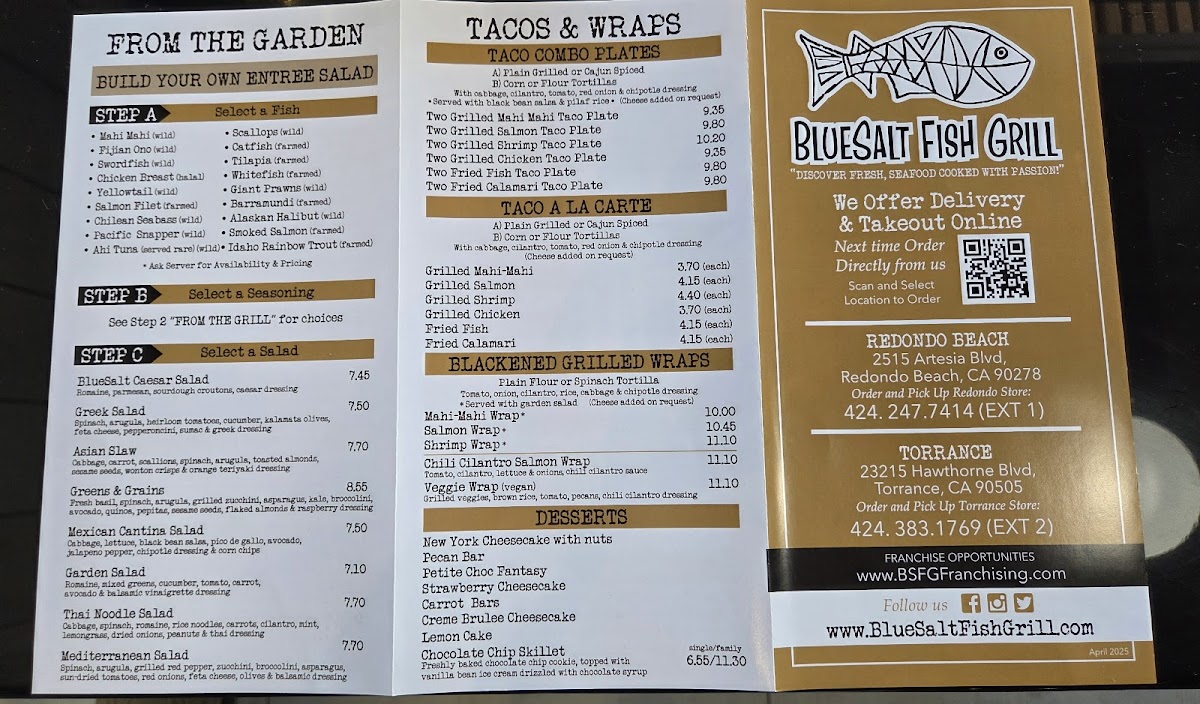 “ Blue Salt Fish Grill in Redondo Beach (Artesia Blvd.) is a fantastic spot for fresh seafood, great service, and a relaxed, family-friendly atmosphere. This local gem truly lives up to its reputation, offering high-quality seafood dishes that cater to both seafood lovers and casual diners alike. We had the chance to try the scallops and shrimp with garlic sauce, black pepper seasoned corns! they were all perfectly cooked—tender, flavorful, and well-seasoned. The fries were crispy and tasty, complementing the seafood beautifully. One of the standout features was their fresh salads, which added a refreshing balance to the meal. Beyond the food, the service was amazing—attentive, friendly, and efficient, making the experience even more enjoyable. It’s clear that Blue Salt Fish Grill is a local favorite, as we saw many families dining in, creating a warm and welcoming environment. If you’re looking for a casual yet high-quality seafood spot in Redondo Beach, Blue Salt Fish Grill is definitely worth a visit. Whether you’re dining in with family or grabbing a quick bite, you can count on delicious, fresh seafood and a great experience. ”